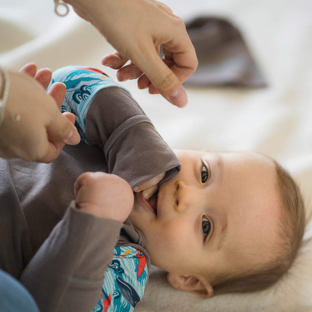 - Tout comme le pantalon, le chandail évolutif permet les deux options. Il suffit de replier le manchon sur la main de bébé pour en faire une petite mitaine protectrice! Une autre bonne chose lorsque bébé raton se grafigne impulsivement! Le col du chandail est conçu pour faciliter le passage de la petite tête fragile.